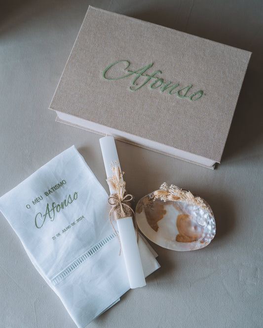 O nosso Kit de Batismo é a escolha perfeita para quem valoriza a qualidade e a tradição. Este conjunto exclusivo é cuidadosamente elaborado com materiais de elevada qualidade e 100% de origem portuguesa, refletindo o melhor do artesanato local.
